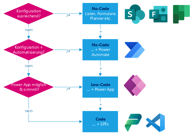 Das Modell ist eine vereinfachte Darstellung und soll aufzeigen, dass sich die verschiedenen Ansätze sehr gut kombinieren lassen. Als Experten auf No-Code, Low-Code und Code helfen wir Ihnen dabei, die volle Leistungsfähigkeit von Microsoft 365 auszuschöpfen, indem wir Ihnen professionelle End-to-End-Lösungen anbieten.